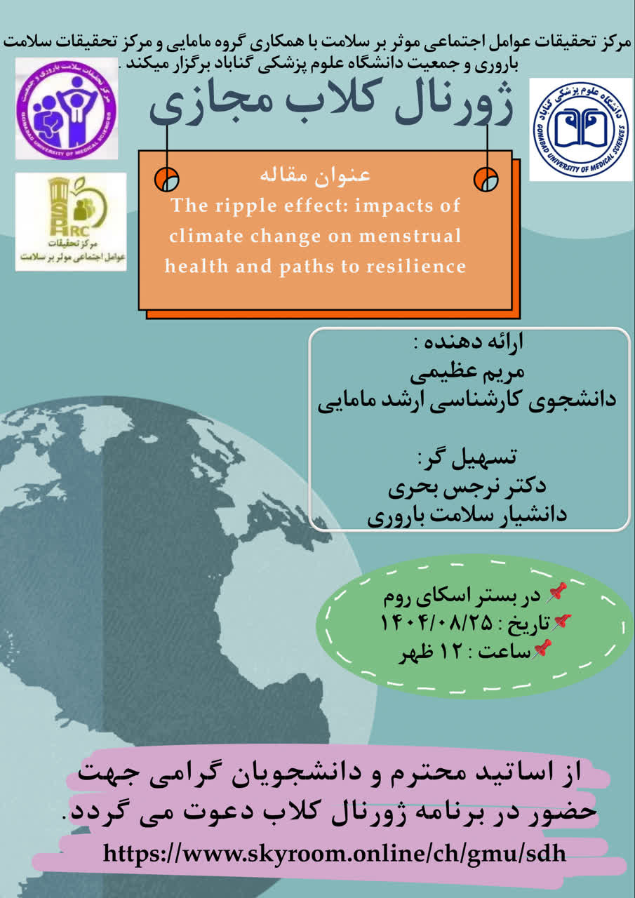 مرکز تحقیقات عوامل اجتماعی موثر بر سلامت با همکاری گروه مامایی و مرکز تحقیقات سلامت باروری و جمعیت دانشگاه ژورنال کلاب مشترک در روز یکشنبه 25آبان ماه1404 ساعت 12ظهر در بستر اسکای روم برگزار خواهد کرد. در این ژورنال کلاب که دانشجوی کارشناسی ارشد مامایی خانم مریم عظیمی و خانم دکتر نرجس بحری بعنوان تسهیل گر حضور خواهند داشت، به تمامی شرکت کننده گان گواهی معتبر اعطا می شود.