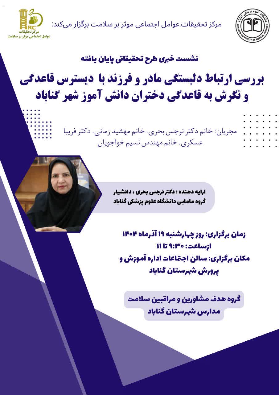 در راستاي كاربردي سازي نتايج تحقيقات و ترجمان دانش طرح های تحقیقاتی پایان یافته، مركز تحقيقات عوامل اجتماعي موثر بر سلامت نشست خبري خود را با عنوان "بررسی ارتباط دلبستگی مادر و فرزند با دیسترس قاعدگی و نگرش به قاعدگی دختران دانش آموز شهر گناباد- 1402"با حضور مشاورین و مراقبین سلامت مدارس شهرستان گناباد واصحاب رسانه در روزچهارشنبه مورخ 19/ 09 / 1404 در محل سالن اجتماعات اداره آموزش و پرورش شهرستان گناباد برگزار کرد.لازم به ذکر است مجری اصلی این طرح خانم دکتر نرجس بحری دانشیار گروه مامایی دانشگاه علوم پزشکی گناباد ،سایر مجریان خانم مهشید زمانی-دکتر فریبا عسکری و مهندس نسیم خواجویان هستند.